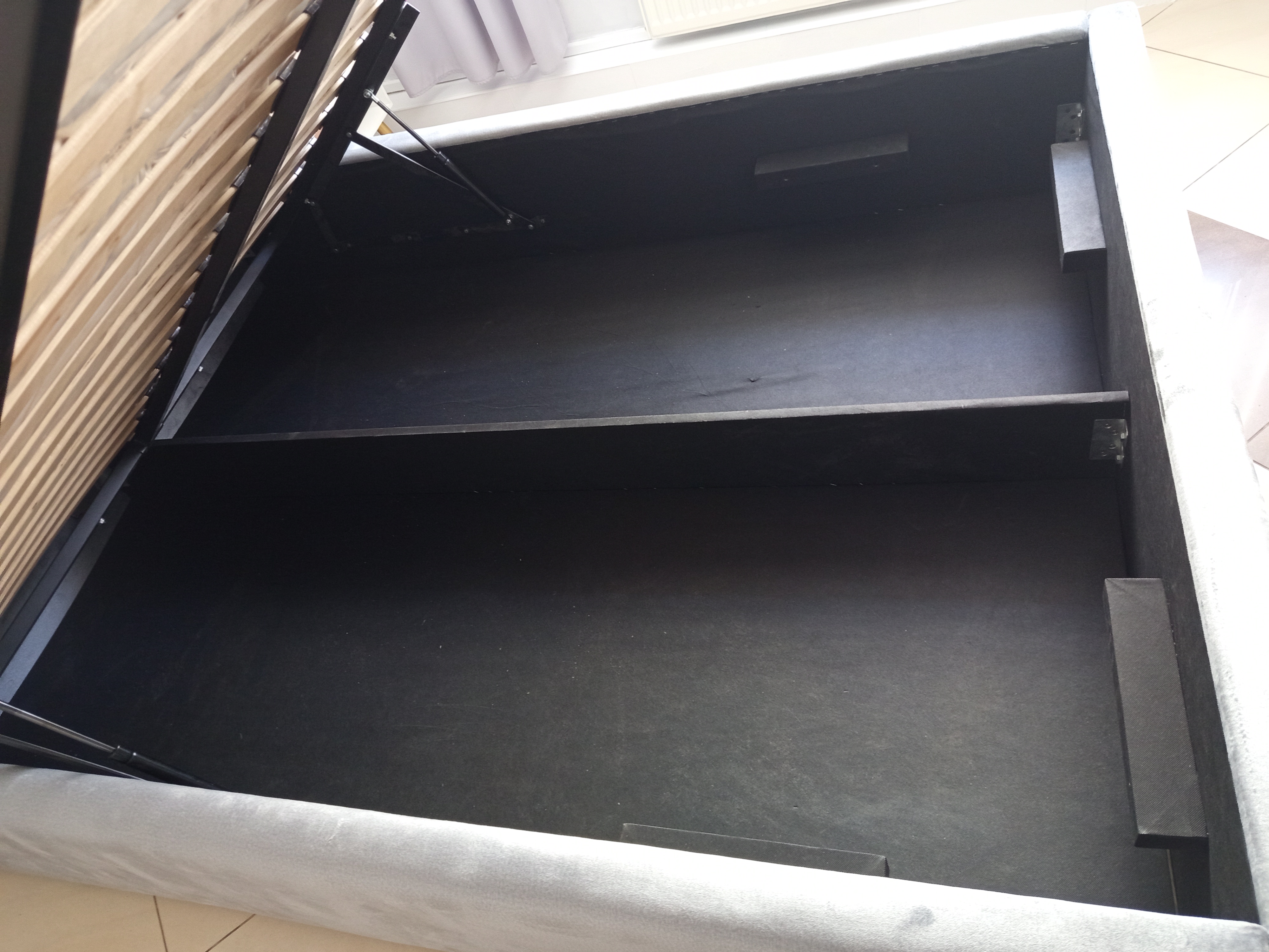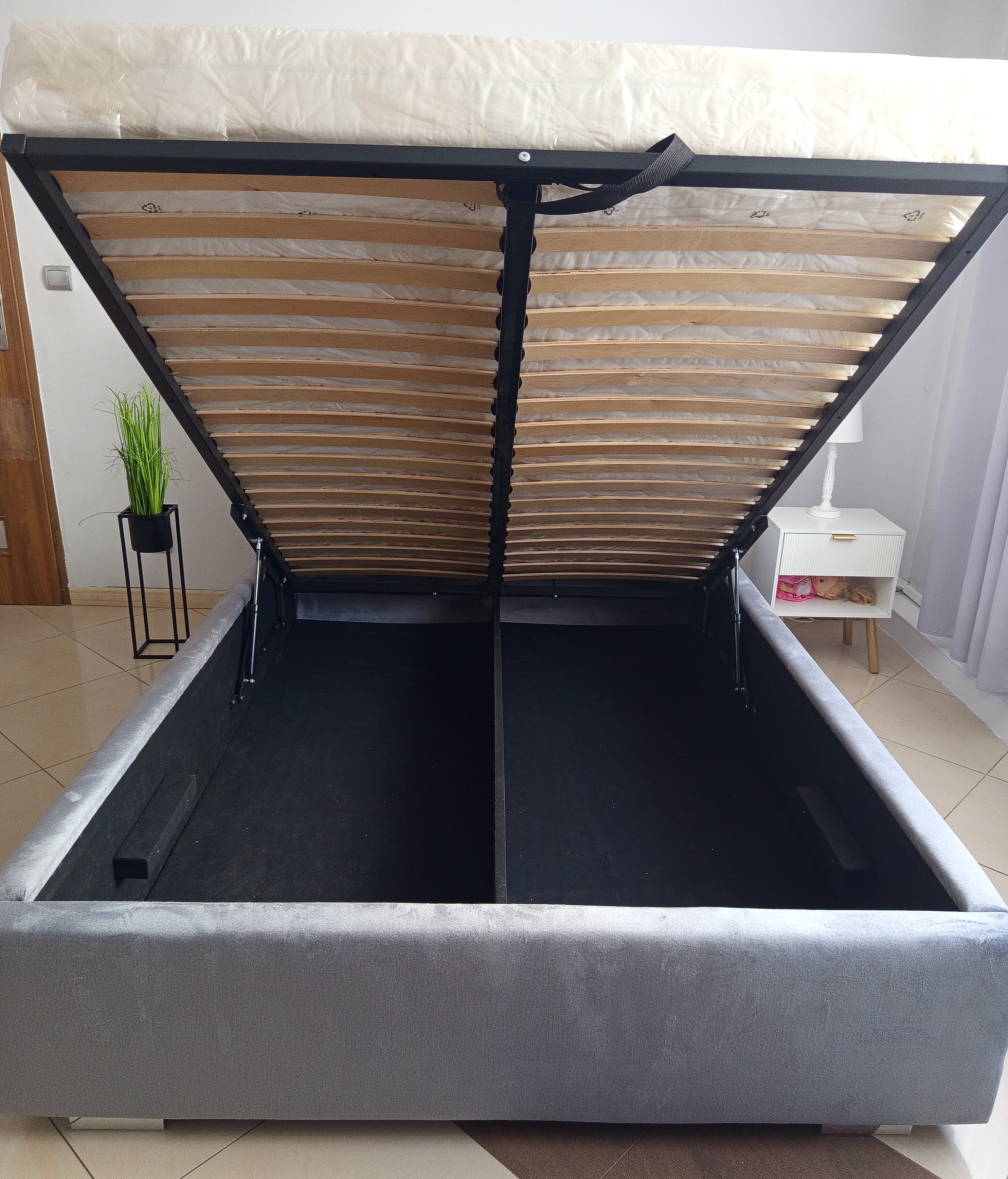 Łóżko wyposażone jest w podnoszony stelaż, który umożliwia łatwy dostęp do przestrzeni pod łóżkiem. Stelaż składa się z 2x18 listew umieszczonych na solidnej metalowej ramie z mocnymi podnośnikami gazowymi o mocy 80 N, zapewnia wyjątkowe wsparcie dla materaca i lekkie otwieranie pojemnika na pościel. To miejsce, w którym możesz przechowywać pościel, koce czy inne przedmioty, które chcesz trzymać poza zasięgiem wzroku.